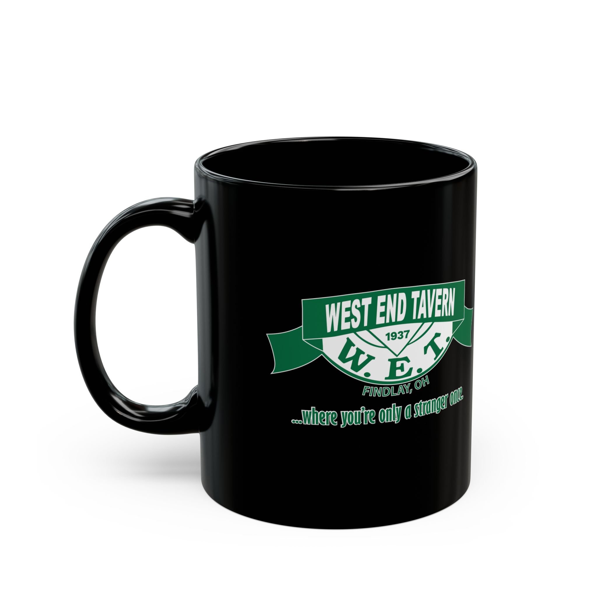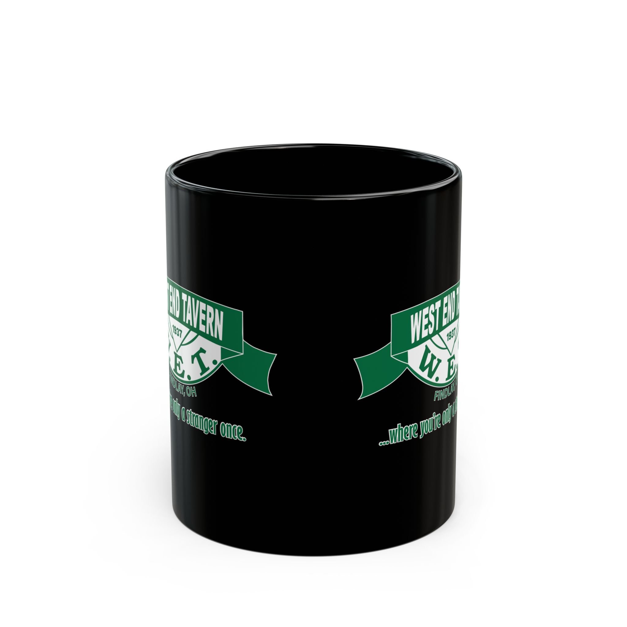 West End Tavern W.E.T. Black Coffee Mug — Retro Bar Logo "Where You're Only a Stranger Once" (11oz/15oz)